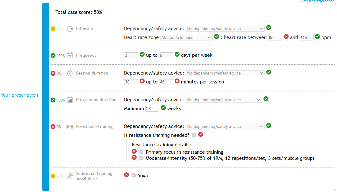 The EXPERT Training Tool allows healthcare professionals to compare their exercise prescriptions to predetermined patient cases with the outcome of the EXPERT Training Tool algorithm, developed according to EAPC and ESC position statements/guidelines and the expert opinions of the EAPC EXPERT group members. The interactive tool also explains the rationale behind the outcome of the exercise prescriptions. The EXPERT Training Tool is intended to be used for educational and (individual) training purposes only, but will help rehabilitation professionals as well as students to further develop exercise prescription skills which are beneficial for their rehabilitation practice. No new patient cases can be entered, you can only train on the 60 predefined training patient cases, which are divided into 4 difficulty levels.